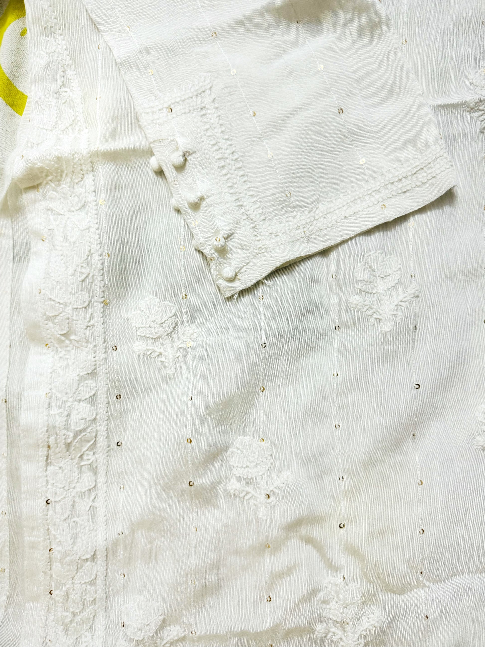 Step into timeless sophistication with our White Mukesh Work Chikankari Kurti. This exquisite piece features delicate Chikankari embroidery adorned with shimmering Mukesh work, adding a touch of subtle glamour to the classic white fabric. The intricate detailing reflects traditional craftsmanship while enhancing the kurti’s modern appeal.