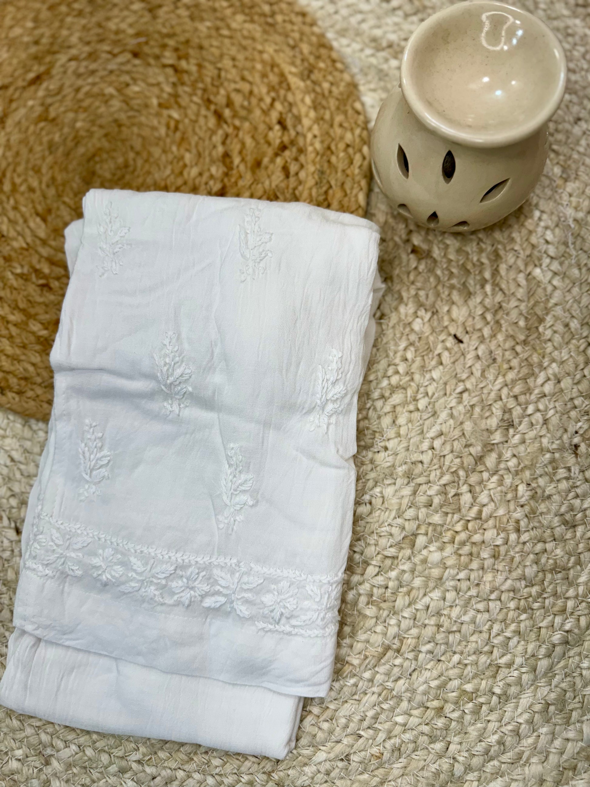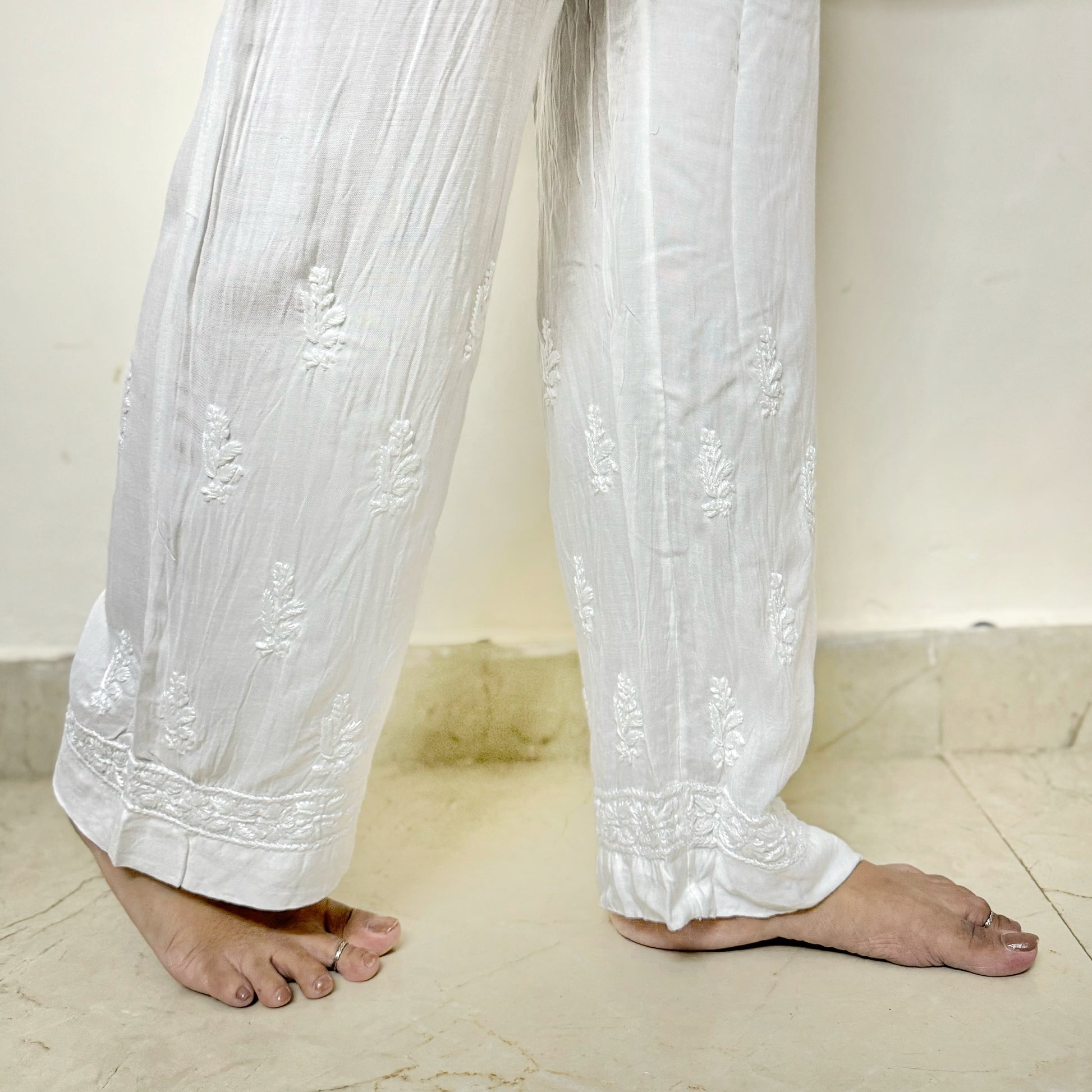 Discover the perfect blend of elegance and comfort with our White Chikankari Pallazo. Crafted from premium fabric and adorned with delicate Chikankari embroidery, these pants offer a refined touch of traditional artistry in a contemporary silhouette.