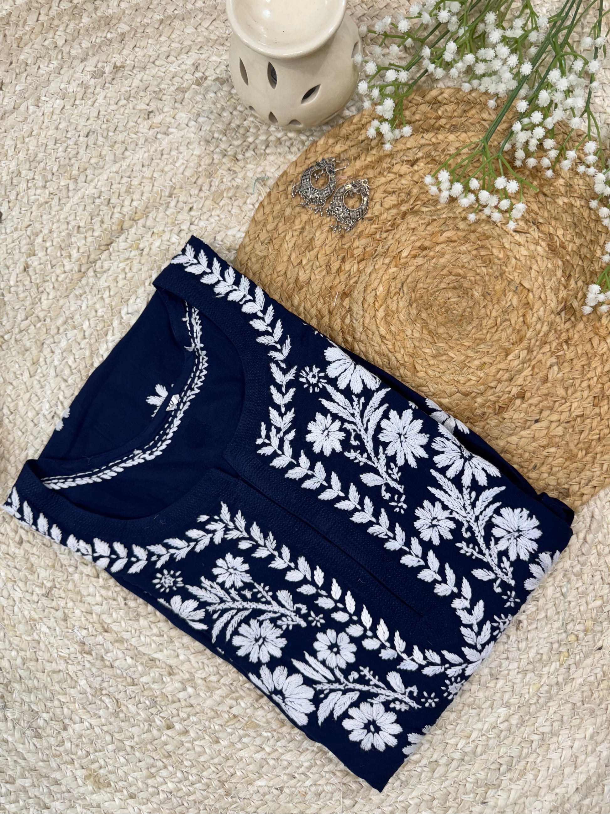 This stunning piece features intricate chikankari embroidery, meticulously handcrafted by skilled artisans. The kurta boasts a graceful neckline adorned with delicate floral and paisley patterns.
